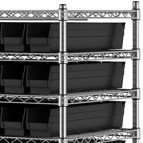 The NSF shelving unit is made of a durable, chrome-plated metal with a clear epoxy coating. It includes 12 shelves, 4 posts, and 118 black injection-molded polypropylene bins, all of which are made to commercial-grade specifications to withstand industrial conditions and for your business's long-lasting use. Each shelf can hold up to an impressive 450 lb. of evenly distributed weight.
