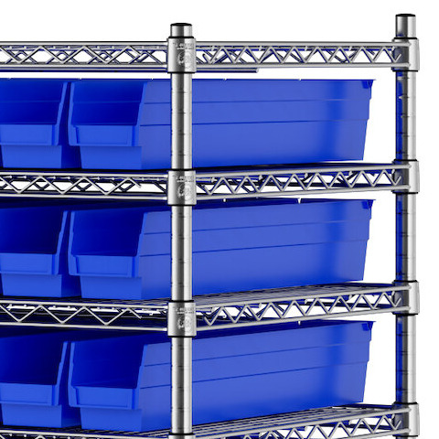 The NSF shelving unit is made of a durable, chrome-plated metal with a clear epoxy coating. It includes 12 shelves, 4 posts, and 118 blue injection-molded polypropylene bins, all of which are made to commercial-grade specifications to withstand industrial conditions and for your business's long-lasting use. Each shelf can hold up to an impressive 450 lb. of evenly distributed weight.