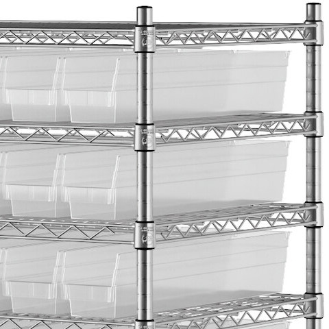 The NSF shelving unit is made of a durable, chrome-plated metal with a clear epoxy coating. It includes 12 shelves, 4 posts, and 118 clear injection-molded polypropylene bins, all of which are made to commercial-grade specifications to withstand industrial conditions and for your business's long-lasting use. Each shelf can hold up to an impressive 450 lb. of evenly distributed weight.