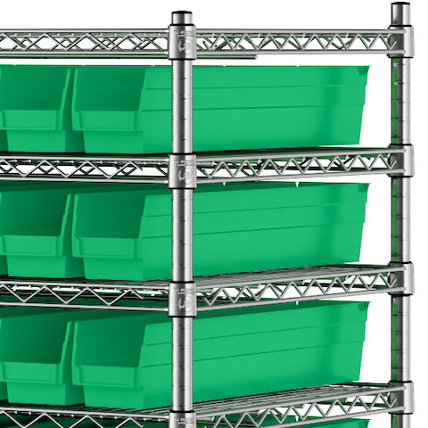 The NSF shelving unit is made of a durable, chrome-plated metal with a clear epoxy coating. It includes 12 shelves, 4 posts, and 118 green injection-molded polypropylene bins, all of which are made to commercial-grade specifications to withstand industrial conditions and for your business's long-lasting use. Each shelf can hold up to an impressive 450 lb. of evenly distributed weight.