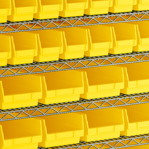 - Includes 12 shelves, 4 posts, and 118 yellow polypropylene bins