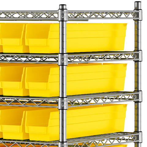 The NSF shelving unit is made of a durable, chrome-plated metal with a clear epoxy coating. It includes 12 shelves, 4 posts, and 118 yellow injection-molded polypropylene bins, all of which are made to commercial-grade specifications to withstand industrial conditions and for your business's long-lasting use. Each shelf can hold up to an impressive 450 lb. of evenly distributed weight.