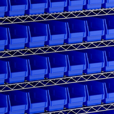 - Includes 12 shelves, 4 posts, and 143 blue polypropylene bins