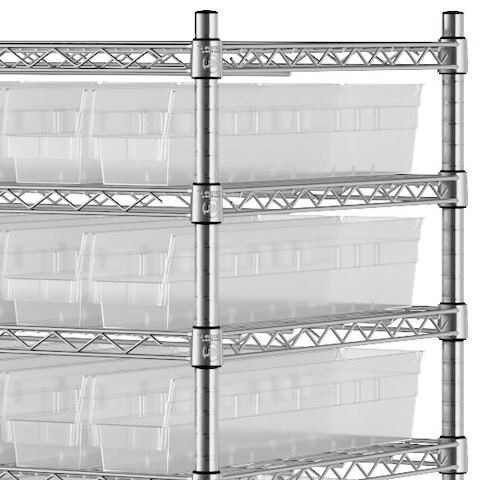 The NSF shelving unit is made of a durable, chrome-plated metal with a clear epoxy coating. It includes 12 shelves, 4 posts, and 143 clear injection-molded polypropylene bins, all of which are made to commercial-grade specifications to withstand industrial conditions and for your business's long-lasting use. Each shelf can hold up to an impressive 450 lb. of evenly distributed weight.
