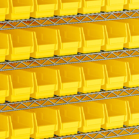 - Includes 12 shelves, 4 posts, and 143 yellow polypropylene bins