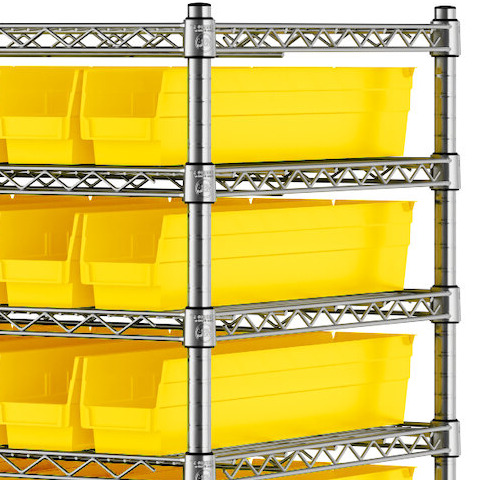 The NSF shelving unit is made of a durable, chrome-plated metal with a clear epoxy coating. It includes 12 shelves, 4 posts, and 143 yellow injection-molded polypropylene bins, all of which are made to commercial-grade specifications to withstand industrial conditions and for your business's long-lasting use. Each shelf can hold up to an impressive 450 lb. of evenly distributed weight.