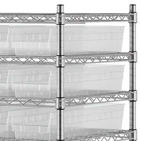 The NSF shelving unit is made of a durable, chrome-plated metal with a clear epoxy coating. It includes 12 shelves, 4 posts, and 88 clear injection-molded polypropylene bins, all of which are made to commercial-grade specifications to withstand industrial conditions and for your business's long-lasting use. Each shelf can hold up to an impressive 450 lb. of evenly distributed weight.