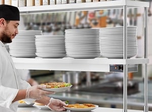 Above the work table, a 12" deep stainless steel double deck overshelf provides a convenient place to mount your strip warmer, while also giving a bit of overhead storage for garnishes, hand tools, plates, and other commonly-used items.