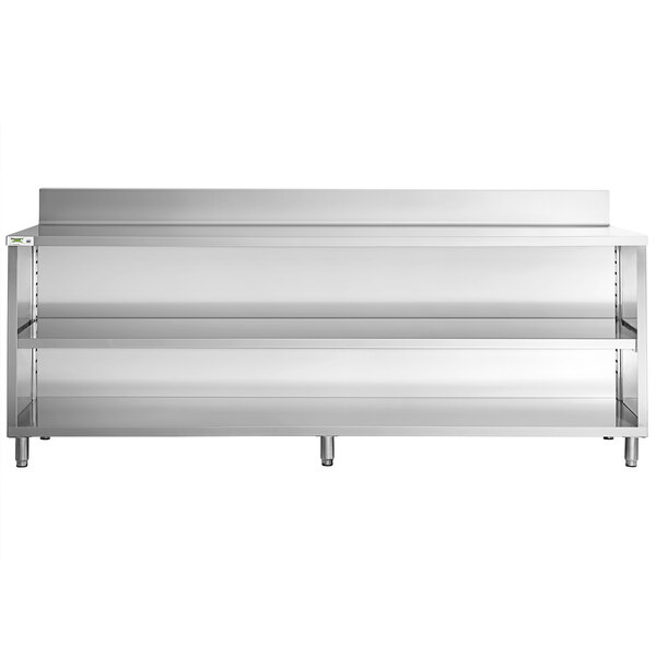 Optimize your commercial workspace with this Regency 24" x 96" 16 gauge type 304 stainless steel enclosed base open front table with adjustable midshelf and 6" backsplash.