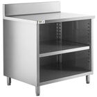 Regency 30" x 36" 16 Gauge Type 304 Stainless Steel Enclosed Base Open Front Table with Adjustable Midshelf and 6" Backsplash
