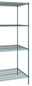 This kit boasts a green epoxy coated wire construction that works well in back-of-house storage and supply areas. Since it resists corrosion from humidity, this shelving unit is a great choice for walk-in coolers, storage rooms, or dish rooms. Its wire shelves do a great job of facilitating proper air flow around your stored supplies, helping to prolong the shelf life of food.
