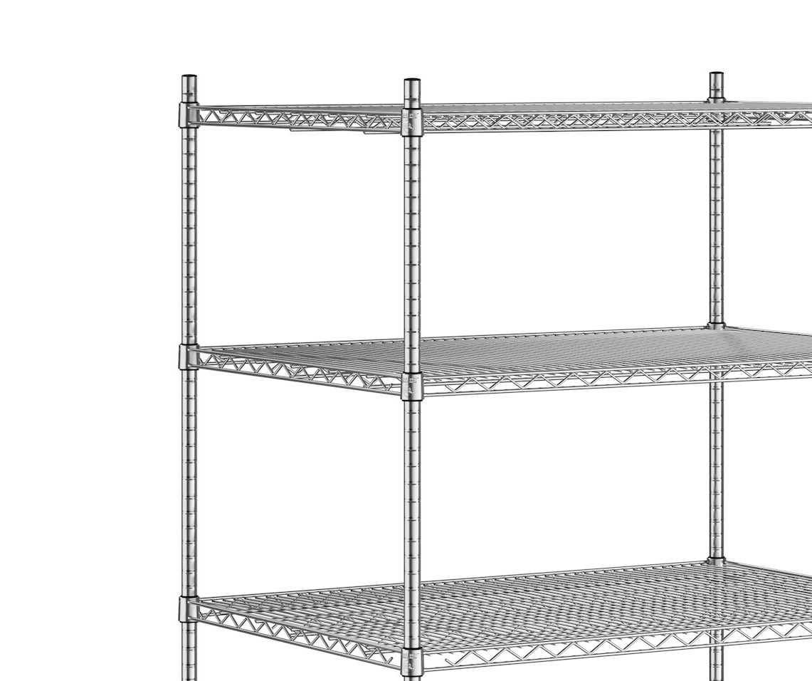 This kit includes (5) 30" x 42" chrome wire shelves, (4) 74" stationary posts, and (20) pairs of split sleeves. This versatile unit allows you to create a convenient storage solution for your janitorial closet or warehouse. Mix and match with Regency accessories (sold separately) to personalize your kit! The shelving unit requires assembly.
