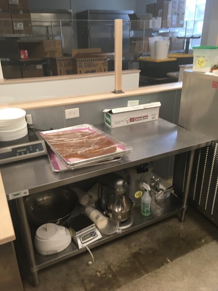 This stainless steel commercial prep table with a storage shelf underneath it is a very high quality product that we use daily and really enjoy.