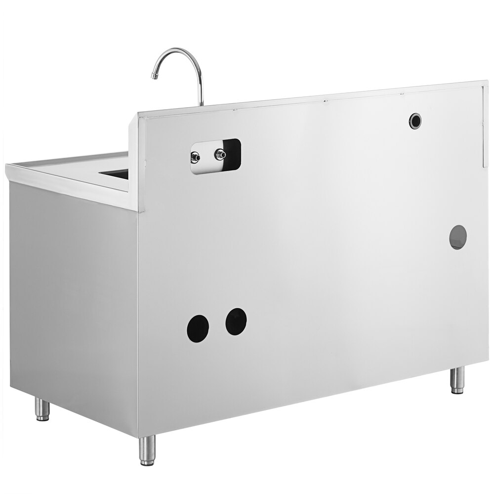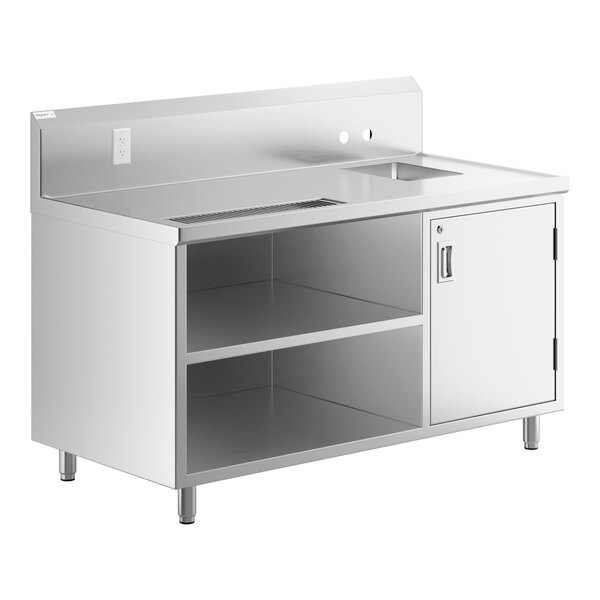A 10" x 14" x 10" deep-drawn sink is conveniently located on the right side of the table for hand washing or dishwashing, while the cabinet underneath the sink has a swinging door that grants access to the sink components. The sink has a 1 1/2" drain basket to catch food debris.