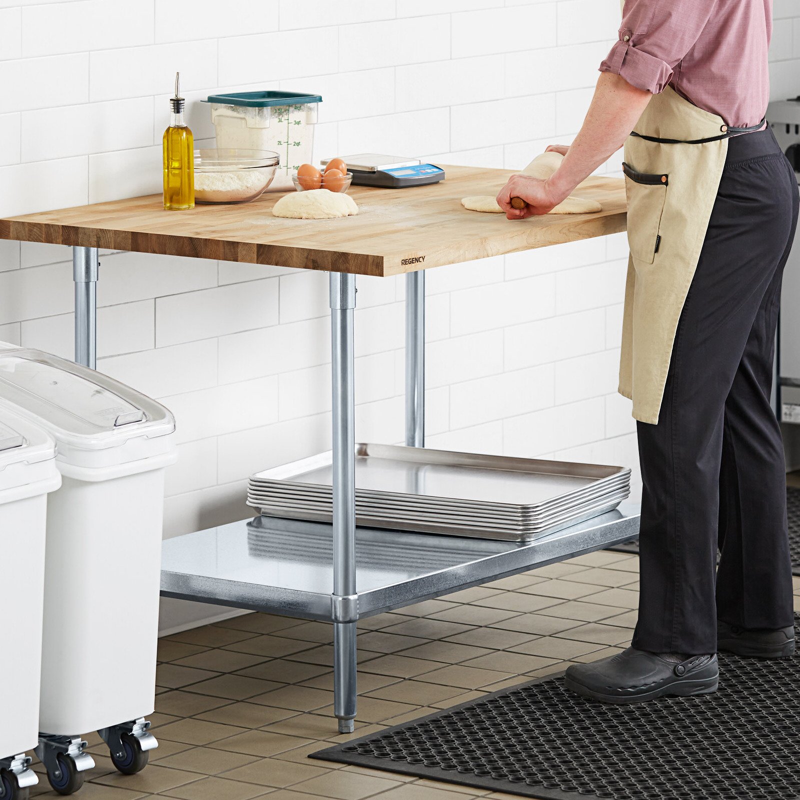 Equip your kitchen with this Regency 36" x 48" wood top work table with galvanized base and adjustable undershelf.