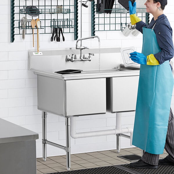 Outfit your facility with a long-lasting sink that will meet your needs with this Regency 43" stainless steel two compartment commercial sink. This durable sink is made with high-quality, welded 16 gauge type 304 stainless steel for durability, corrosion resistance, and long-lasting use. It's dipped a minimum of 1/4" to facilitate better drainage, and it also features 1 5/8" diameter stainless steel legs with stainless steel cross bracing, sockets, and bullet feet provide added stability.