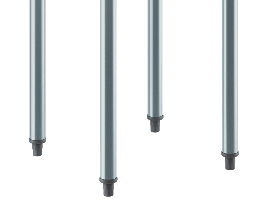 The four 1 5/8" galvanized steel legs with sockets sit on adjustable plastic bullet feet for added stability.