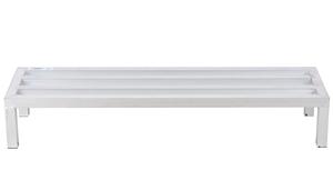 This rack helps you store sensitive items carefully while taking up a minimal amount of space. It can hold up to 1400 lb. of product 8" off the ground, keeping you in compliance with sanitary health codes. Whether you need to add storage to your walk-in refrigerator or freezer, or need to store bulk dry ingredients in a storage room, this Regency aluminum dunnage rack will fit the bill.