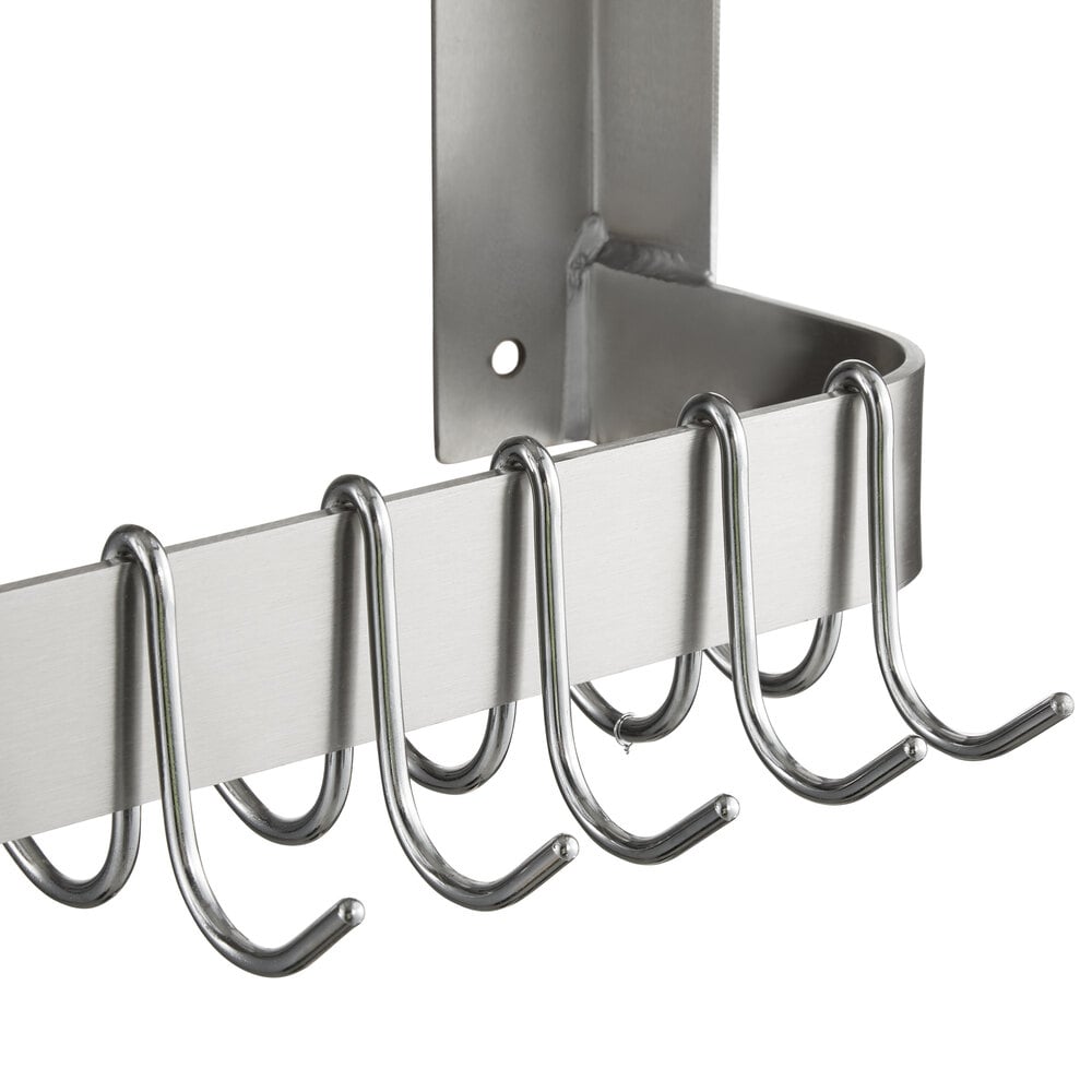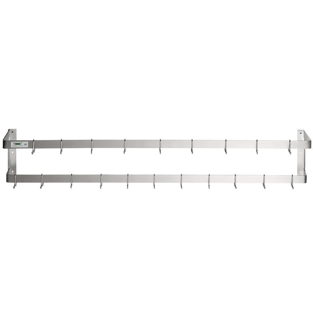 Using the Regency 72” wall mounted commercial stainless steel double line pot rack is an easy way to keep your busy kitchen organized. This rack attaches directly to your wall, freeing up valuable space in your facility. Simply install it above your work table or food prep area to create a more streamlined, efficient space for your staff.