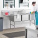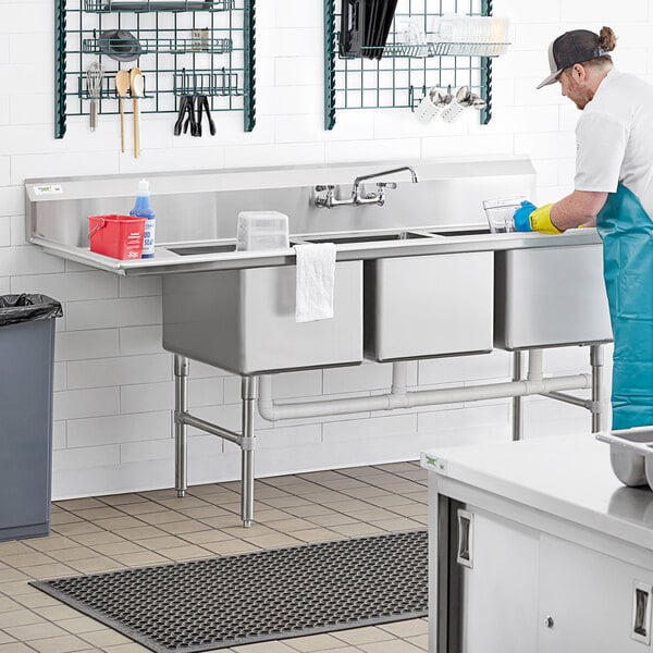 Outfit your facility with a long-lasting sink that will meet your needs with this Regency 78 1/2" stainless steel three compartment sink with 1 drainboard. This durable sink is made with high-quality, welded 16 gauge type 304 stainless steel for durability, corrosion resistance, and long-lasting use. This sink features a 34" work surface height with a sturdy 18" left-side drainboard, allowing you to easily wash and dry dishes and utensils in one convenient location. It's also dipped a minimum of 1/4" to facilitate better drainage. This item's 1 5/8" diameter stainless steel legs with stainless steel cross bracing, sockets, and bullet feet provide added stability.