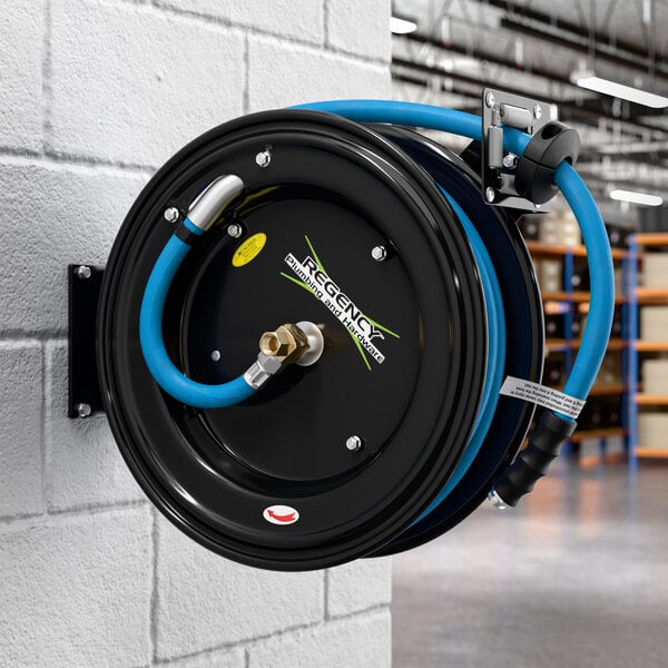 Equip your business with the Regency black powder-coated steel open air / water hose reel with a 30' hose! Designed for versatile use in air and water applications, this convenient, spring-driven modular hose reel can be located precisely where it's needed most. With a multi-fit bracket, the base is built to be mounted on walls, ceilings, or floors for convenient access in janitorial locations and commercial kitchens. This item is made with a black powder-coated, corrosion-resistant steel housing for durable, long-lasting use and includes (1) 30' hose with a 3/4" inner diameter for air and water applications.