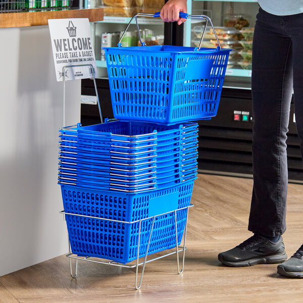 Optimize your in-store convenience and increase your customer's shopping experience with the help of this Regency blue 18 11/16" x 12 3/8" plastic grocery market shopping basket with stand and sign kit!