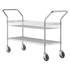 An excellent addition to your office, warehouse, retail facility, or food service establishment, this cart provides the strength that you need in your commercial location. With this utility cart, you can easily move large products around your establishment. This product features one flat shelf and one basket shelf with a weight capacity of 600 lb. per shelf, making it perfect for maneuvering heavier supplies. Crafted from durable chrome materials, this item is sure to stand up to long-term use in your commercial environment.