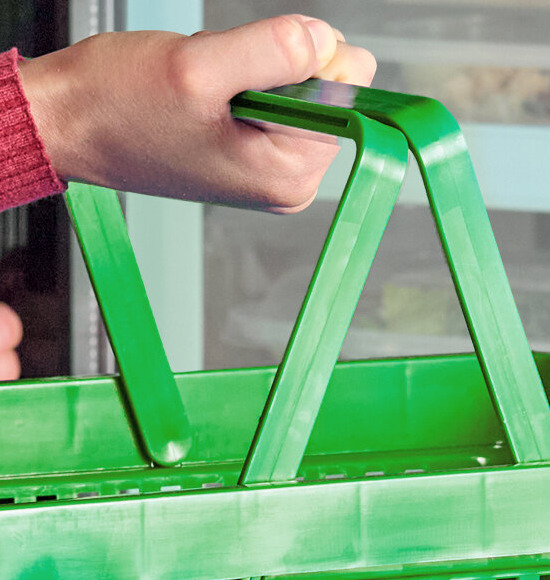 The basket's two plastic handles are wide and flat for more even distribution of weight, as opposed to thin round handles that can be uncomfortable to carry.