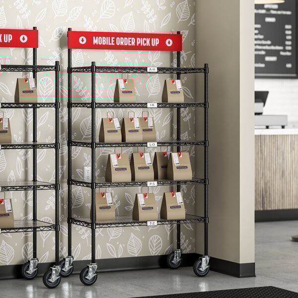 Maximize your storage space with this Regency 18" x 36" x 70" NSF black epoxy mobile take-out shelving station with 5 shelves and PVC shelf mat overlay.