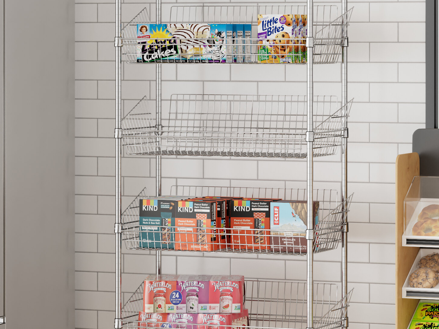 - Drop front and sloped sides of the basket contain products while providing easy access