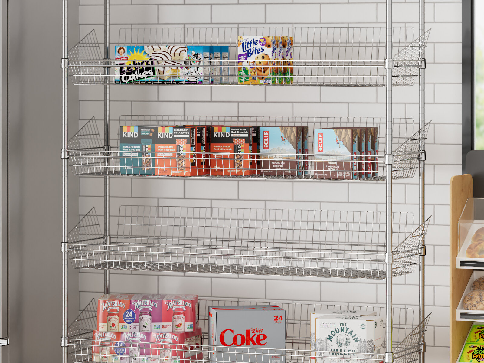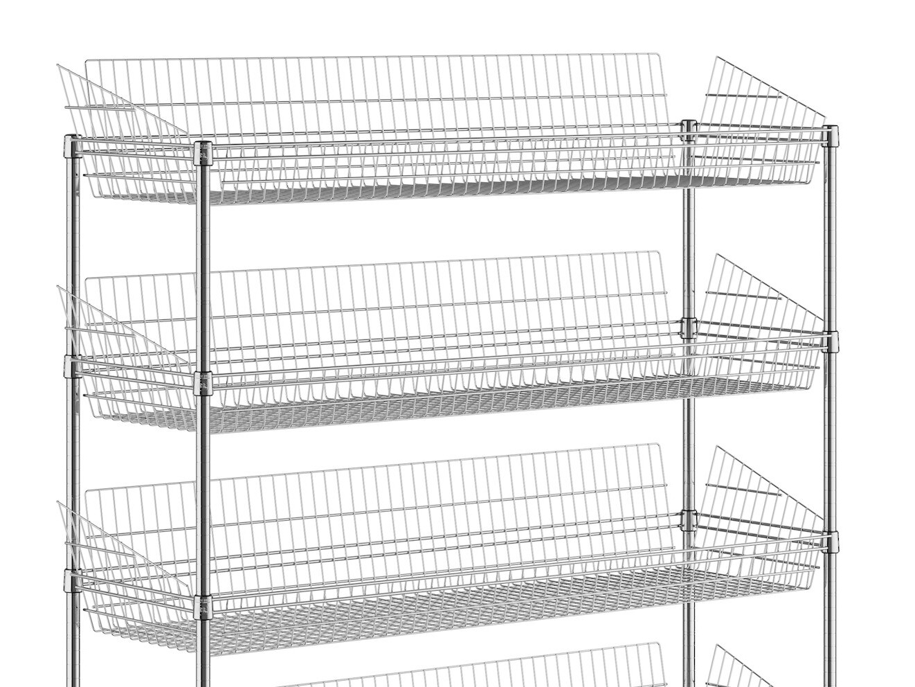- Drop front and sloped sides of the basket contain products while providing easy access