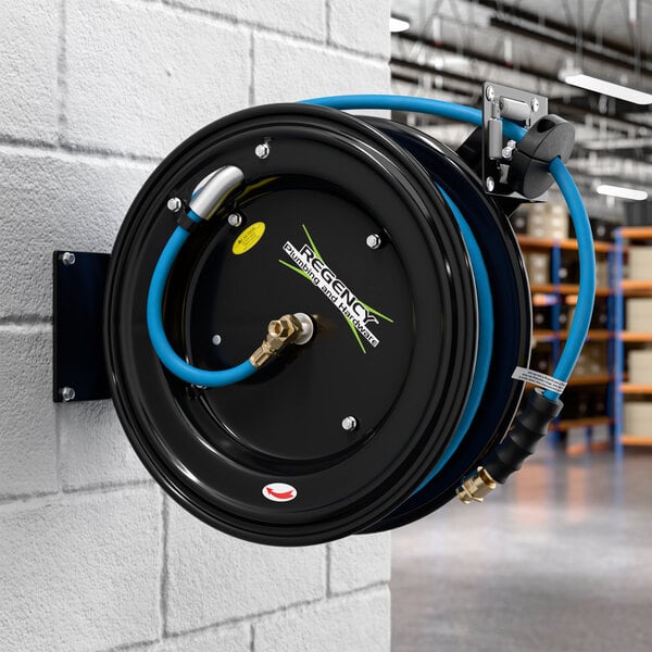 Equip your business with the Regency open powder-coated steel air / water hose reel with a 100' hose! With a multi-fit bracket, the base is built to mount on a wall or floor for convenient access in janitorial locations and commercial kitchens. Highly versatile, this spring-driven hose reel can be located precisely where you need it.