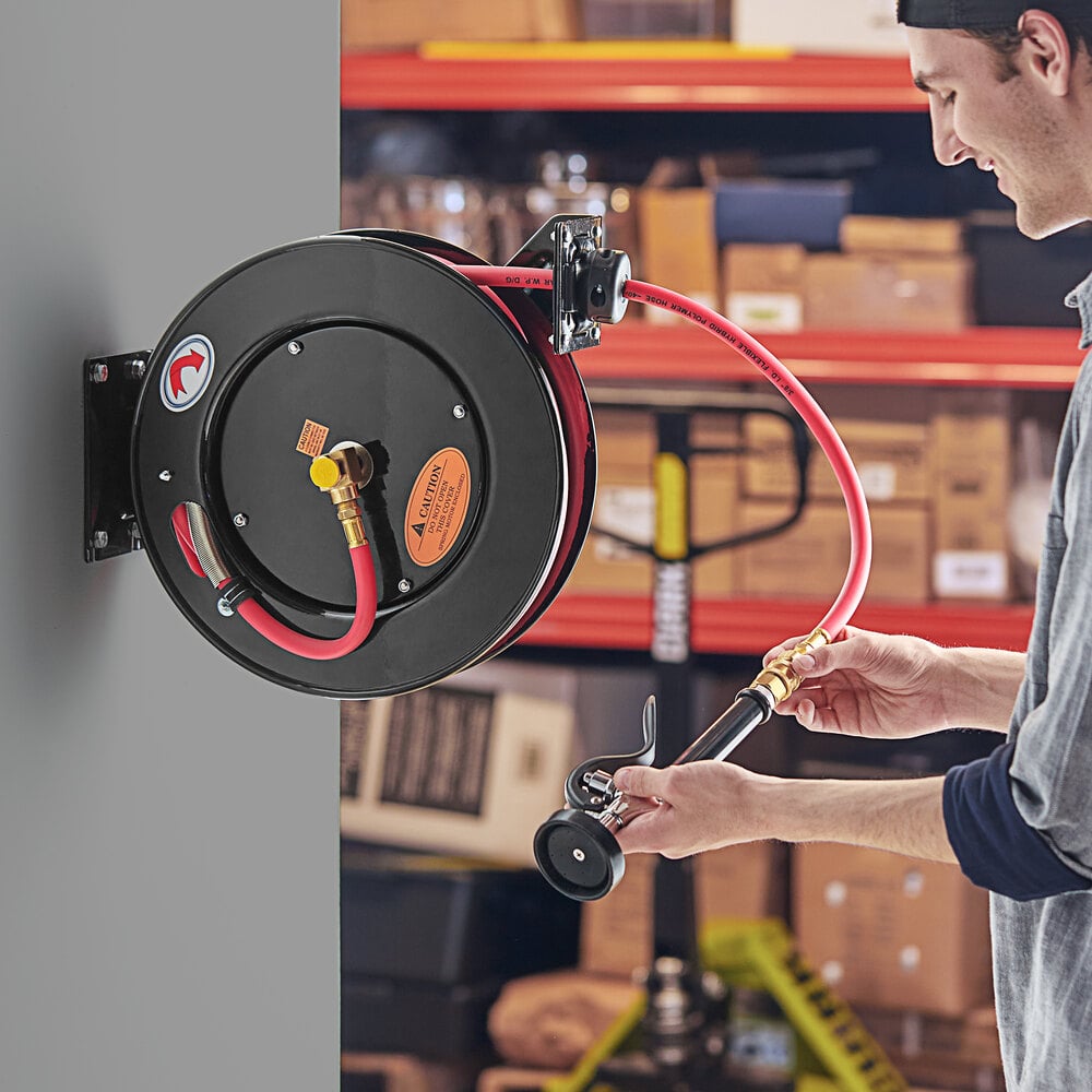 Equip your business with the Regency open powder-coated steel hose reel with a hose and spray valve!