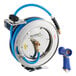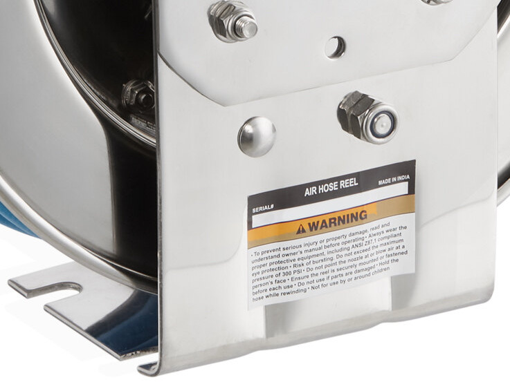 The reinforced steel-stamped flange adds additional strength to the reel, while the spring reducer prevents wear to maintain the integrity of the hose. Additional features include the swivel joint that prevents leakage and the hose stopper that can automatically stop the retracting hose. This unit has a 3/8 inlet / outlet and it is rated to 300 PSI.