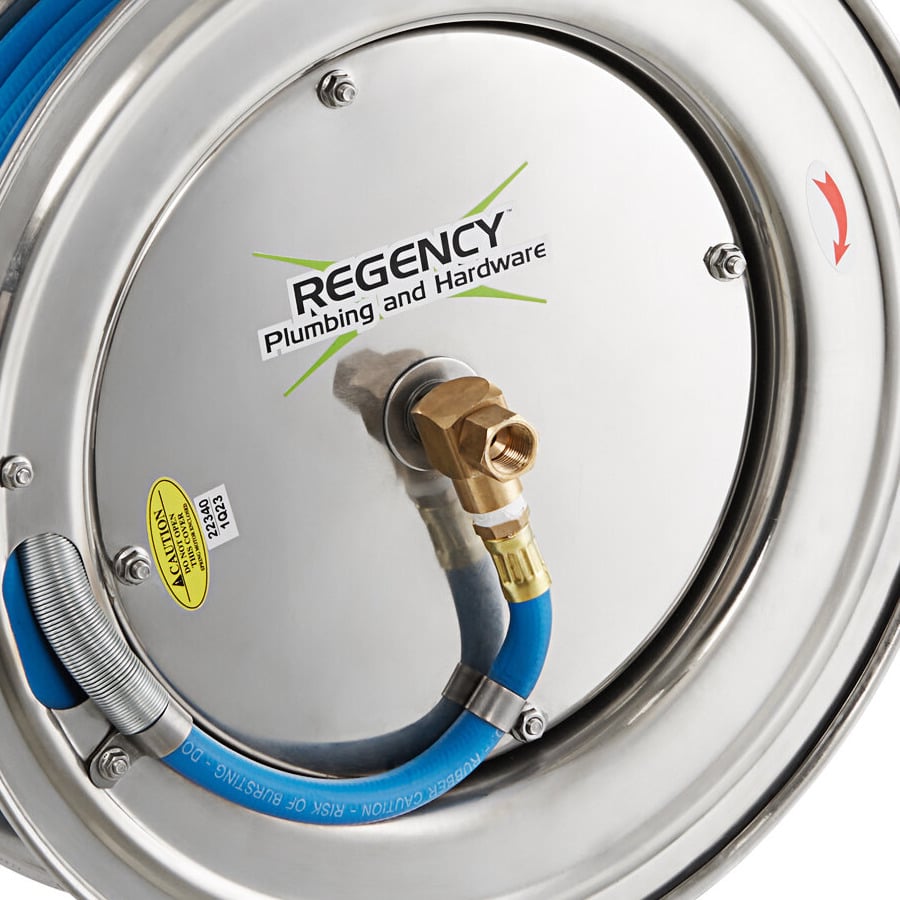 - Item #: 600hrss50svRegency Open Stainless Steel Hose Reel with 50' x 3/8" Hose and Spray Valve