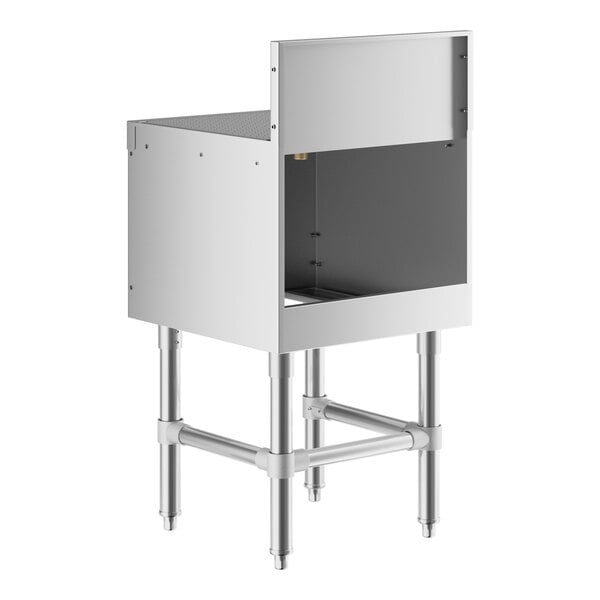 The sturdy stainless steel legs with U-shaped cross bracing and plastic bullet feet ensure stability during use. This stainless steel underbar drainboard has a durable and efficient design, making it the perfect addition to your restaurant or bar.