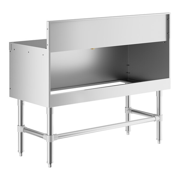 The sturdy stainless steel legs with U-shaped cross bracing and plastic bullet feet ensure stability during use. This stainless steel underbar drainboard has a durable and efficient design, making it the perfect addition to your restaurant or bar.