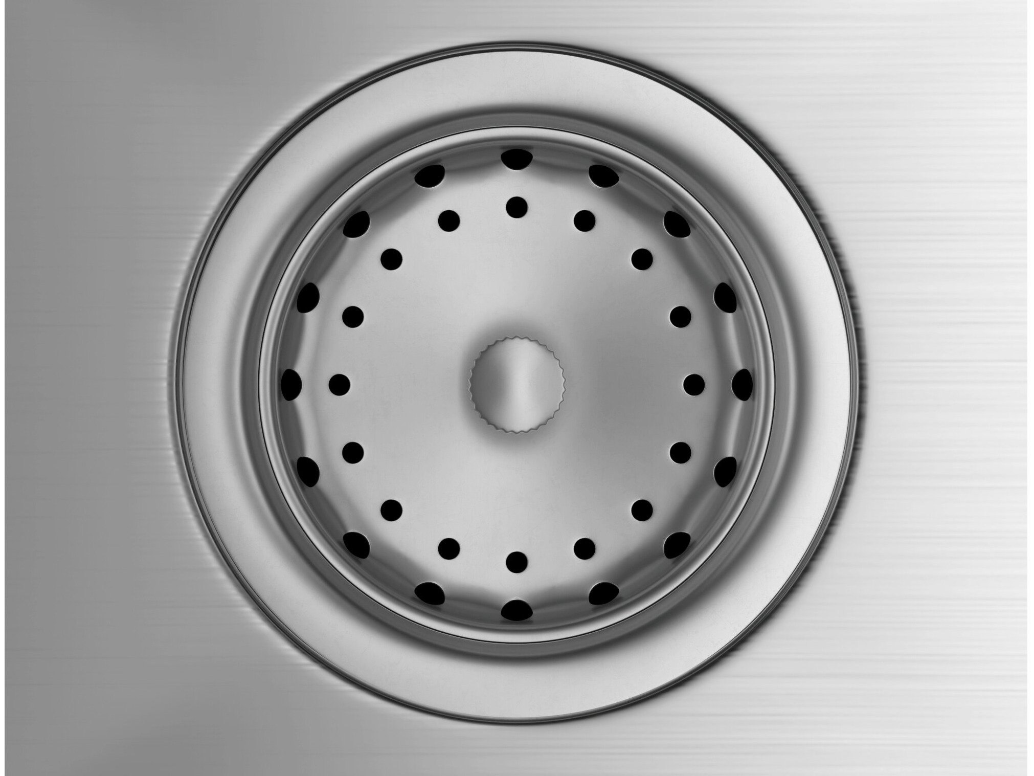 This sink comes with a 3 1/2" basket strainer to catch food debris, which prevents the drain from clogging.