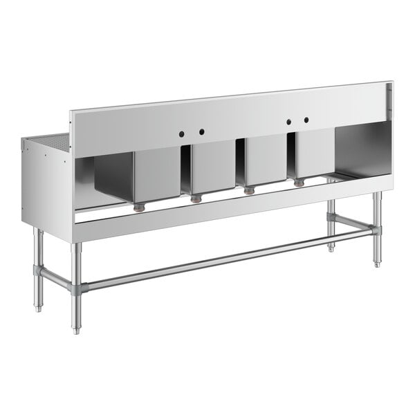 This underbar sink boasts four separate bowls and two drainboards to help you keep up with the demand for glassware at your establishment. It offers a convenient space to wash, rinse, or sanitize dirty glassware from behind your bar. It has a tall 7" backsplash, which helps prevent splashes and overflow, and its 1 1/2" IPS drainage connection safely drains wastewater during use. It also comes with an 8" overflow pipe to help prevent flooding.