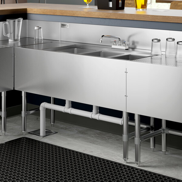 This heavy-duty underbar sink boasts three separate bowls and a drainboard to help you keep up with the demand for glassware at your bar. The perfect addition to your full bar line build, it offers a convenient space to wash, rinse, or sanitize dirty glassware from behind your bar.