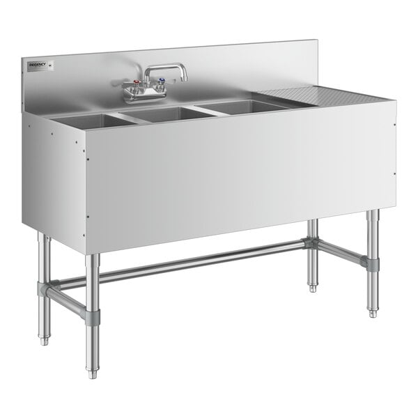- Item #: 60b3194812rksRegency Spec Line Stainless Steel Three Bowl Underbar Sink with 12" Right Drainboard and Faucet - 19" x 48"
