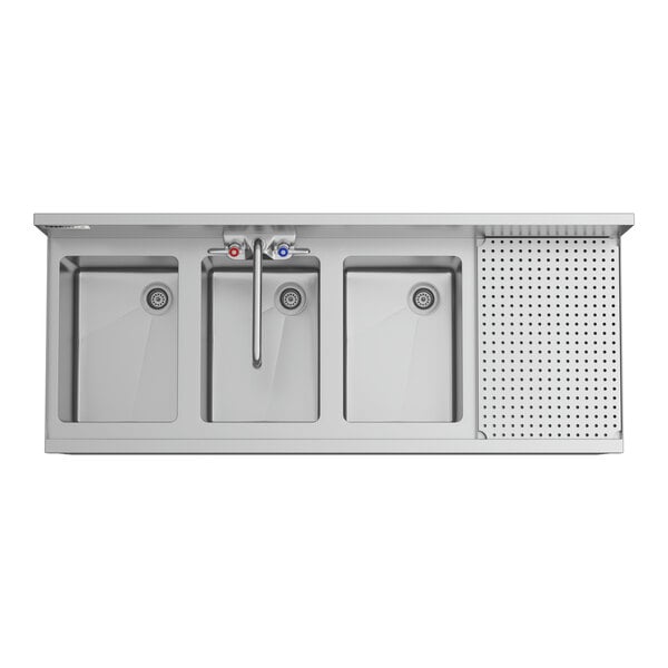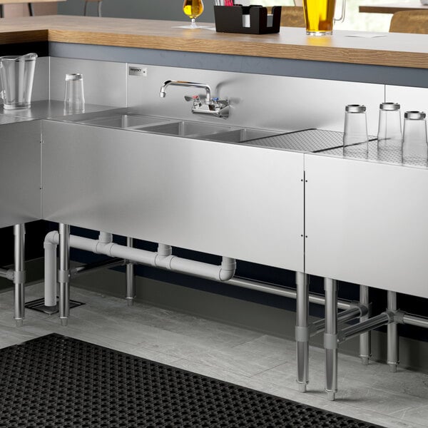 This underbar sink boasts three separate bowls and a drainboard to help you keep up with the demand for glassware at your bar. It offers a convenient space to wash, rinse, or sanitize dirty glassware from behind your bar.
