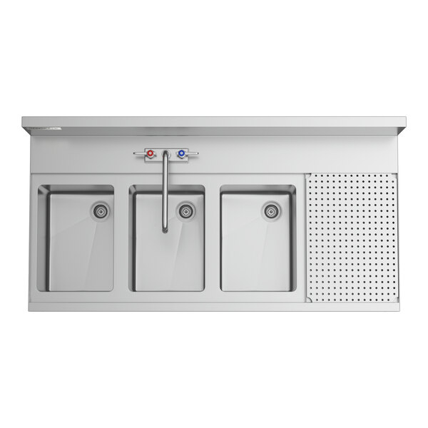 This underbar sink boasts three separate bowls and a drainboard to help you keep up with the demand for glassware at your bar. It offers a convenient space to wash, rinse, or sanitize dirty glassware from behind your bar.