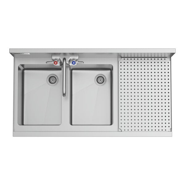 Each bowl is 10" deep, so you can wash even your tallest beer glasses and pitchers. Plus, this sink has holes punched on 4" centers to accept the included 8" wall-mount faucet with swing nozzle. It features (1) 12" drainboard on the right side, so you can easily wash and dry your barware in one convenient location.
