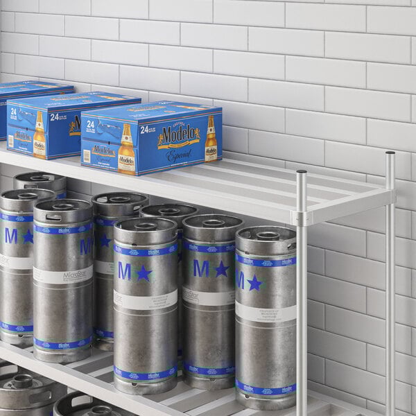 Designed for use with Regency keg racks, this shelf is a perfect replacement for the top shelf on a Regency aluminum keg rack (sold separately), making for convenient adjustment that ensures this unit serves your needs at all times. It is also easy to assemble, so you can get it from the box to the storage room quickly.