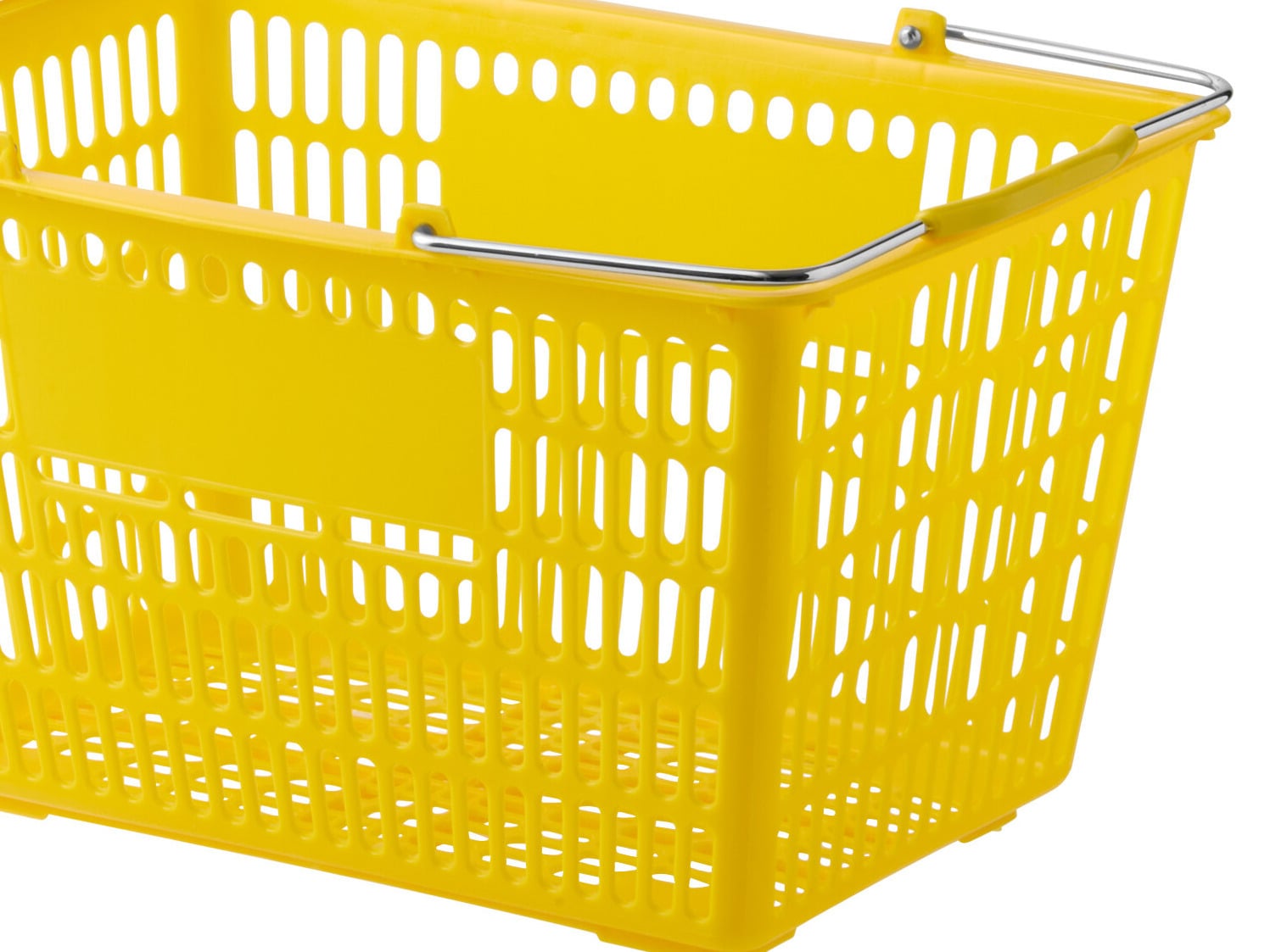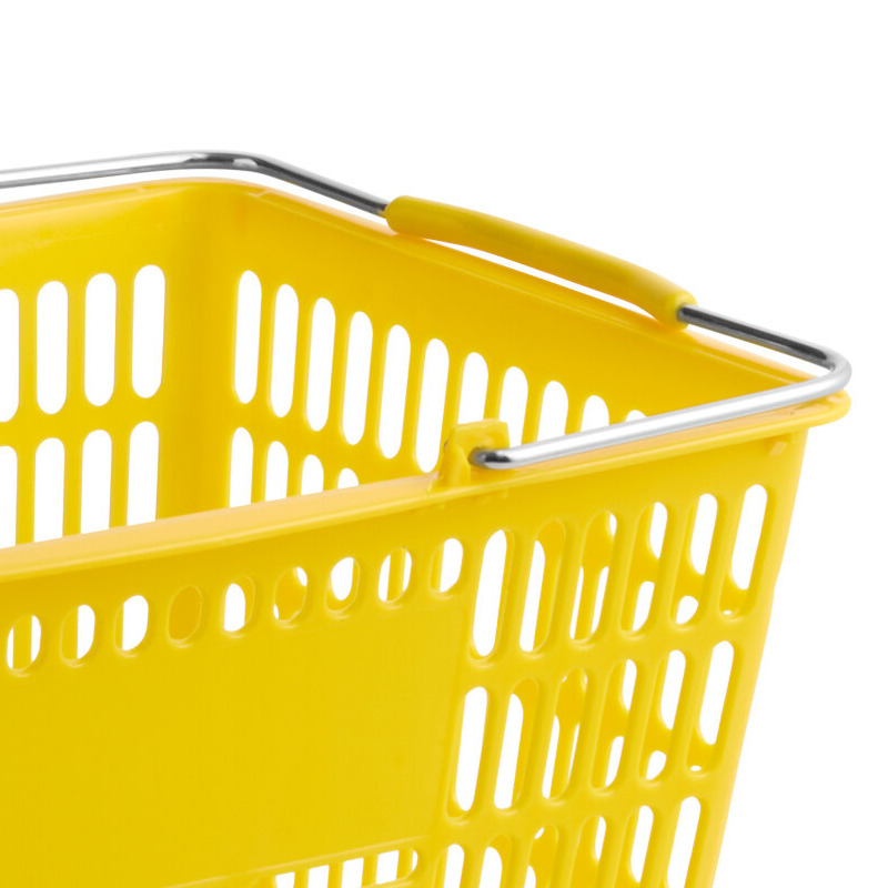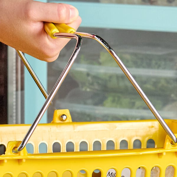 The basket's two steel handles offer superior strength and support, making it much stronger than traditional baskets with plastic handles. Plus, each handle has a yellow grip for your customers' comfort while shopping.