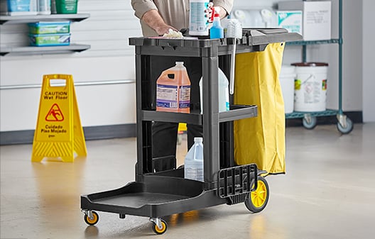 Easily move your cleaning products and keep them well organized with janitorial cleaning carts.