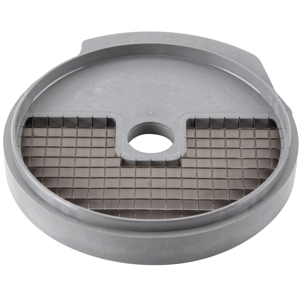 A 3/8" dicing grid works with the slicer plate to form the product into small cubes for use in soups, salads, and other recipes.