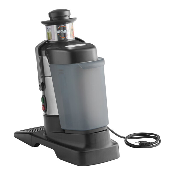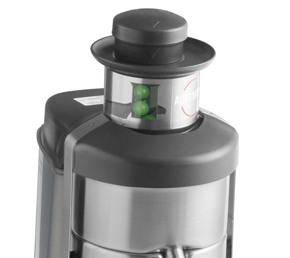 The auto feed system makes it easy to continuously add fruits and vegetables to the juicer. Simple push-button controls let you easily turn the juicer on and off. This Robot Coupe J80 Buffet requires a 120V electrical connection for operation.