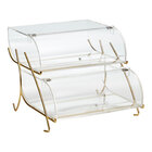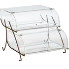 With this Rosseto BK022 clear acrylic two-tier pastry display case with bronze wire stand, offering fresh-baked bread, decadent desserts, and ultra-moist muffins at your self-service station has never been easier! This bakery display case is designed to offer optimum versatility with two independent tiers that are great for displaying a variety of donuts, pastries, bagels, and croissants. Use it to house bags of chips, fresh fruit, candy bars, and other grab-and-go snacks, too!